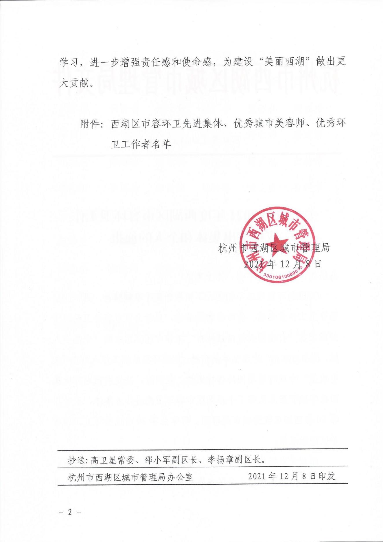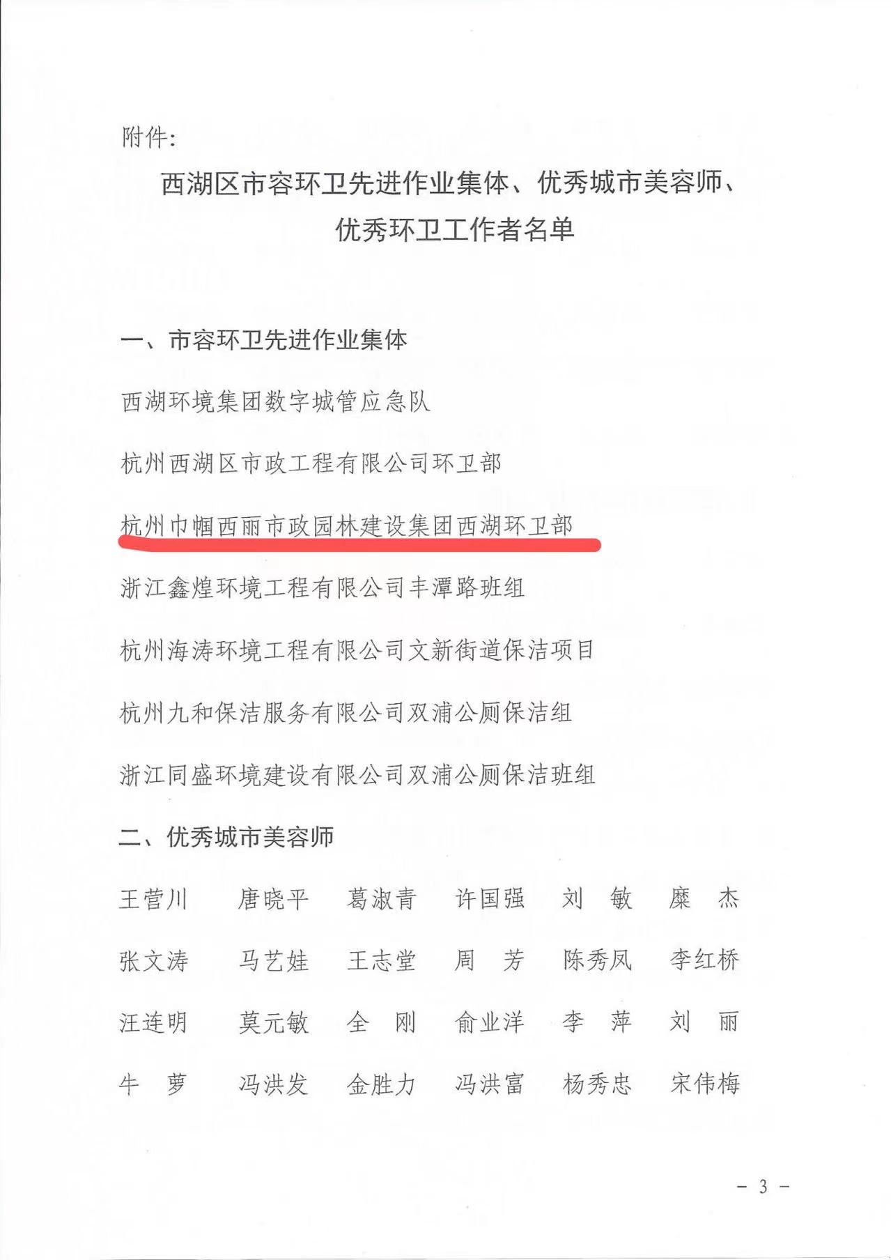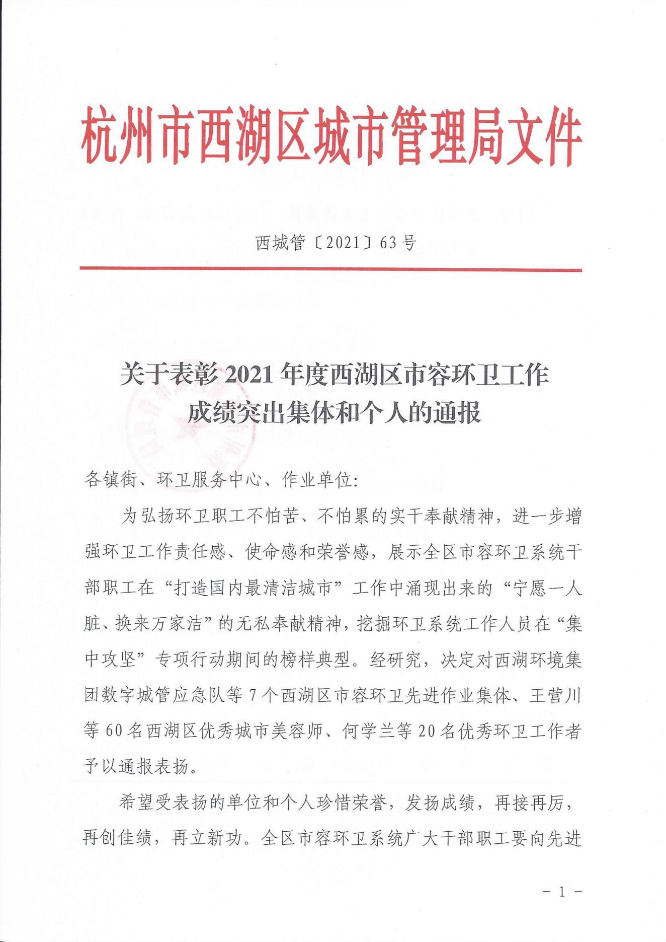 近日,2021年度西湖區(qū)市容環(huán)衛(wèi)工作成績(jī)突出集體和個(gè)人公布,巾幗西麗集團(tuán)榮獲“西湖區(qū)市容環(huán)衛(wèi)先進(jìn)作業(yè)集體”稱(chēng)號(hào)。