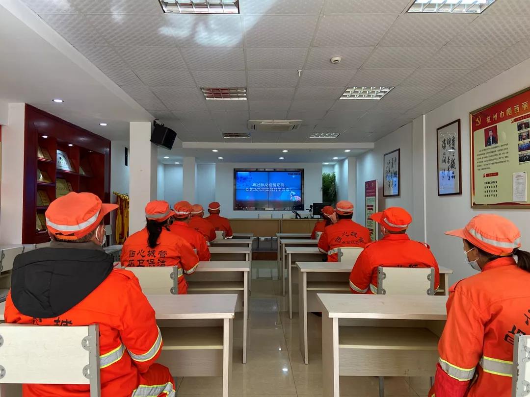 公司組織一線員工開展新冠病毒核酸檢測全民普篩相關(guān)業(yè)務(wù)培訓(xùn)工作,全力筑牢疫情防控“環(huán)衛(wèi)防線”。培訓(xùn)根據(jù)《杭州市城管系統(tǒng)公共場所消毒工作方案》,結(jié)合項(xiàng)目部保潔區(qū)域環(huán)衛(wèi)工作的實(shí)際情況,從“公共場所應(yīng)如何科學(xué)消毒”和“疫情下的個(gè)人防護(hù)”兩塊展開詳細(xì)講解。通過觀看視頻、講座和問答考試的形式,讓員工提高防疫知識(shí),提升防疫工作技能,增加自我防范意識(shí)。