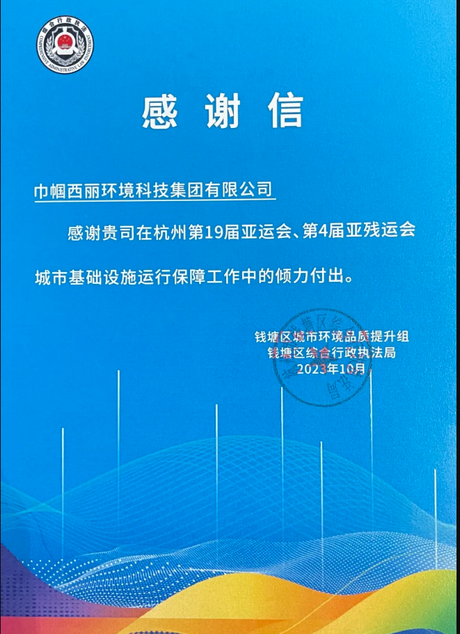 近日,巾幗西麗集團收到了來自錢塘區(qū)城市環(huán)境品質(zhì)提升組、錢塘區(qū)綜合行政執(zhí)法局送來的感謝信,對巾幗西麗集團在杭州第19屆亞運會、第4屆亞殘運會城市基礎(chǔ)設(shè)施運行的保障工作表示贊揚與感謝。