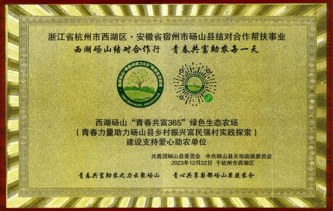 在碭山縣駐杭州青年人才工作站成立揭牌暨西湖碭山“青春共富365”綠色生態(tài)農(nóng)場成立發(fā)布儀式上,巾幗西麗集團被授予“建設(shè)支持愛心助農(nóng)單位”榮譽。