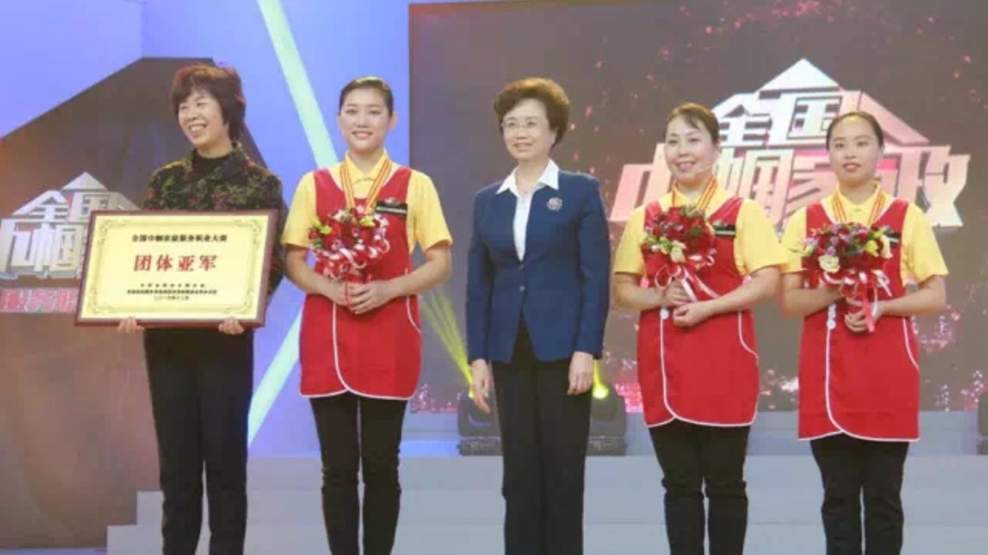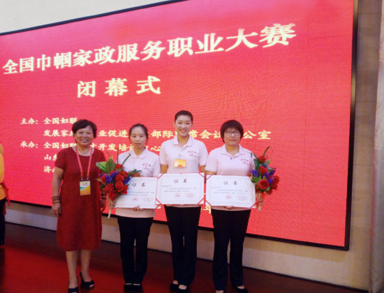 ▲2016年8月公司黃圓媛等三名員工代表浙江省參加全國巾幗西麗家政服務(wù)職業(yè)大賽初賽獲得總分第二名,董事長丁常菊與三名選手合影。
